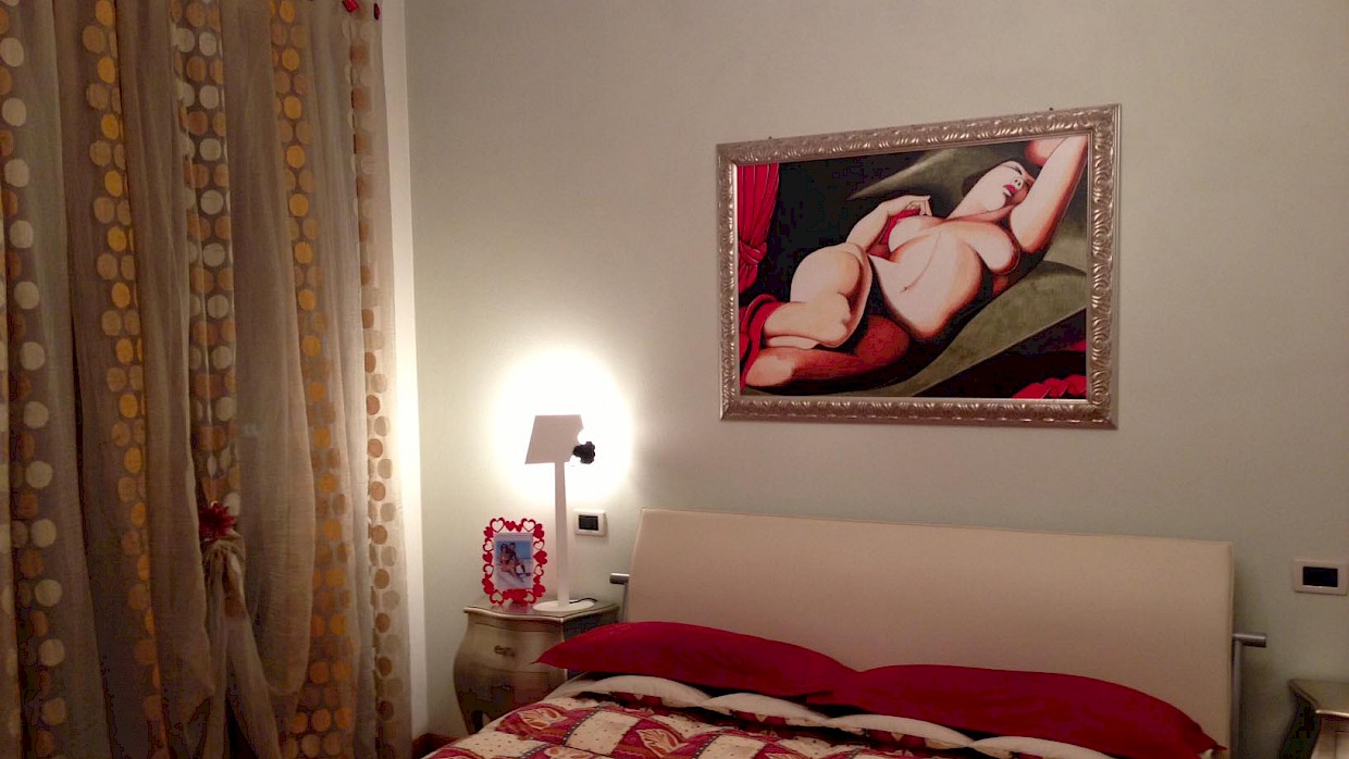 In camera matrimoniale, caratterizzata da un'atmosfera più decisa, con i colori del rosso bordeaux e oro/argento dei particolari, è stato scelto il verde veneziano per la parete di fondo, decisamente il top come accostamento per esaltare i bei quadri di sapore vagamente antico.