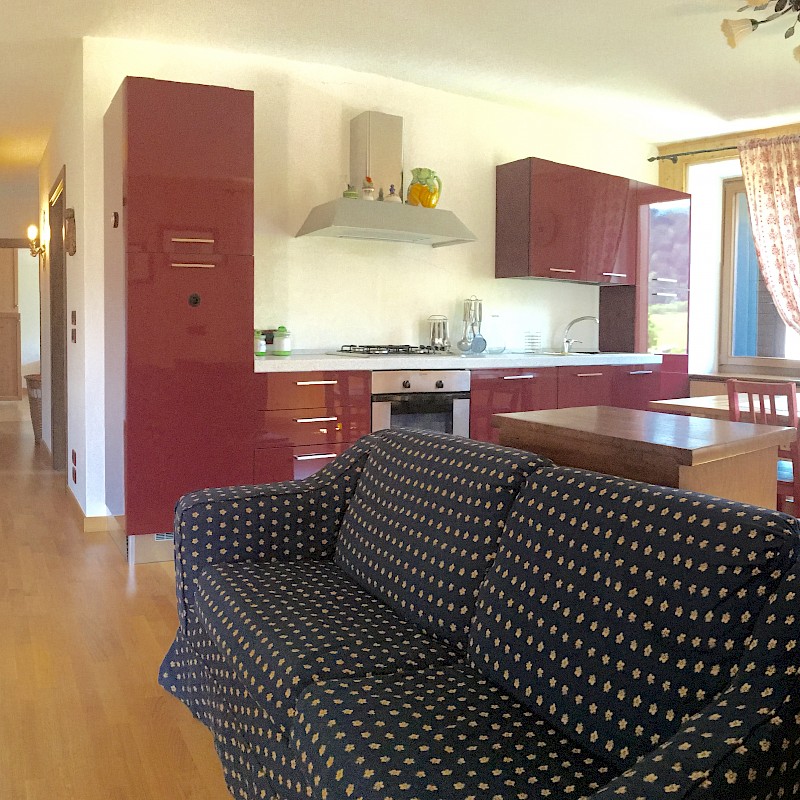 L’ appartamento destinato ai padroni di casa rispecchia pienamente il loro carattere. In continua evoluzione, accosta elementi di grande modernità, come l’angolo cottura, con ante in laminato lucido e accessori in acciaio satinato, e la zona pranzo, caratterizzata da un grande tavolo in pino dalla linea semplice e moderna, a mobili antichi provenienti dalla famiglia della padrona di casa, come l’antica panca in legno situata nella zona relax, a piccoli e grandi oggetti scovati nei mercatini di antiquariato. Il colori scelti sono quelli predominanti della natura calda del legno, accostati a colori della tradizione montana, in particolare il rosso bordeaux della cucina e della stufa a pellet e il verde dei letti in pino. Le caratteristiche tende della zona pranzo sono state confezionate accostando un tessuto antico caratterizzato dai particolari disegni del luogo ad un tessuto grezzo di filo di ortica, entrambi trovati al mercatino delle pulci.